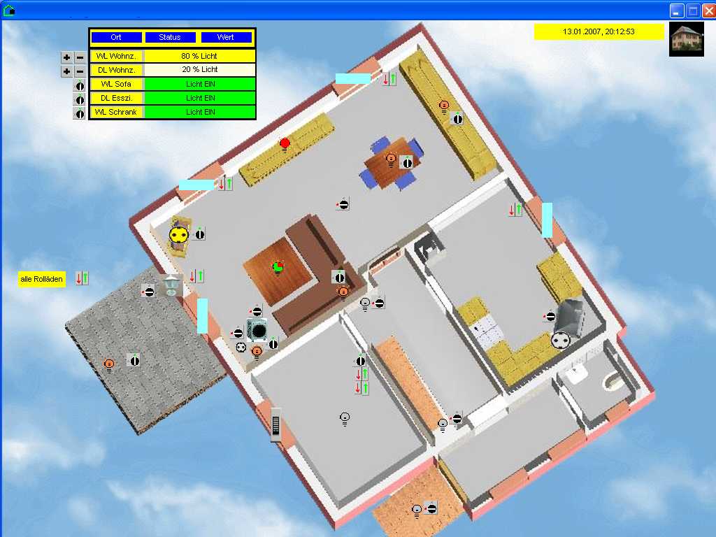 Darstellung des EG Grundrisses:diverse Leuchten/Steckdosen sind eingeschaltet. Die Symbole der Leuchten/Steckdosen sind dynamisch d.h. sie ändern ihr aussehen nach dem Schaltzustand. Die Symbole können selbst erstellt werden.